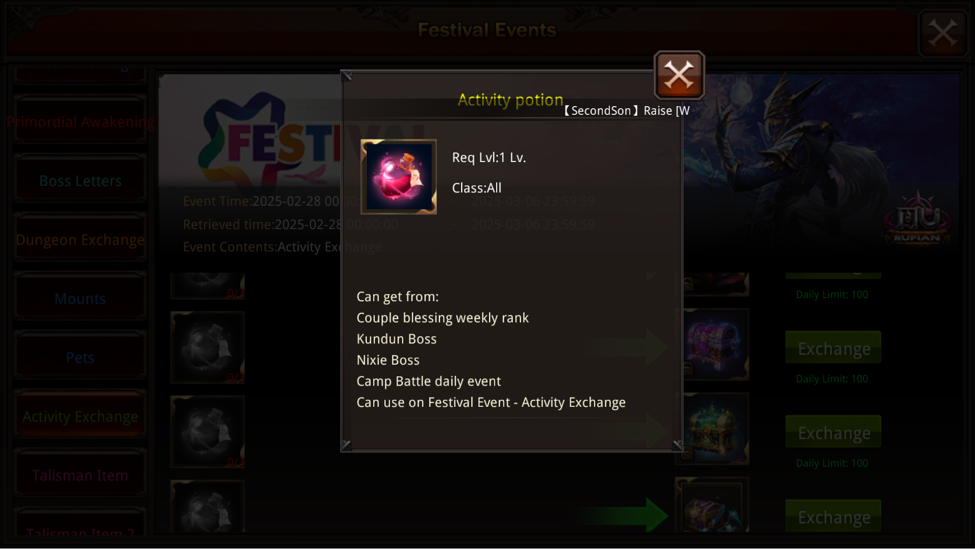 You can get from Couple Blessing Weekly Rank, Kundun & Nixie world boss and Camp Battle daily event